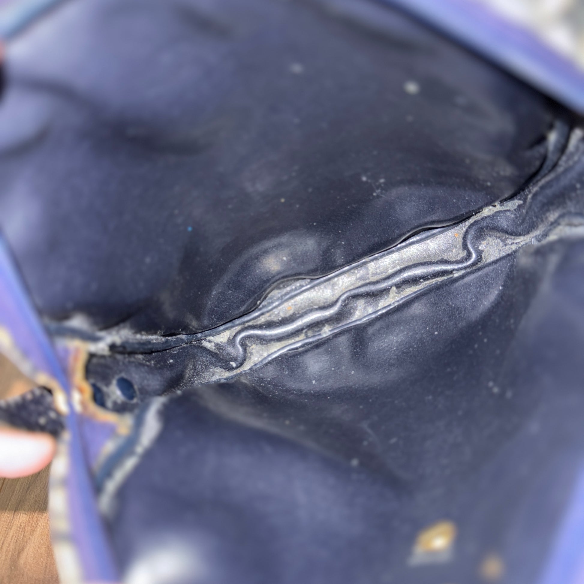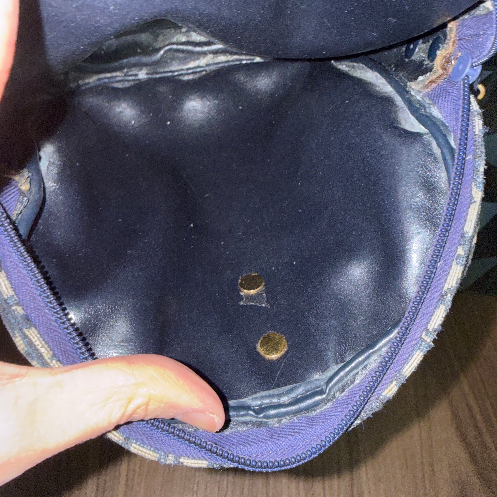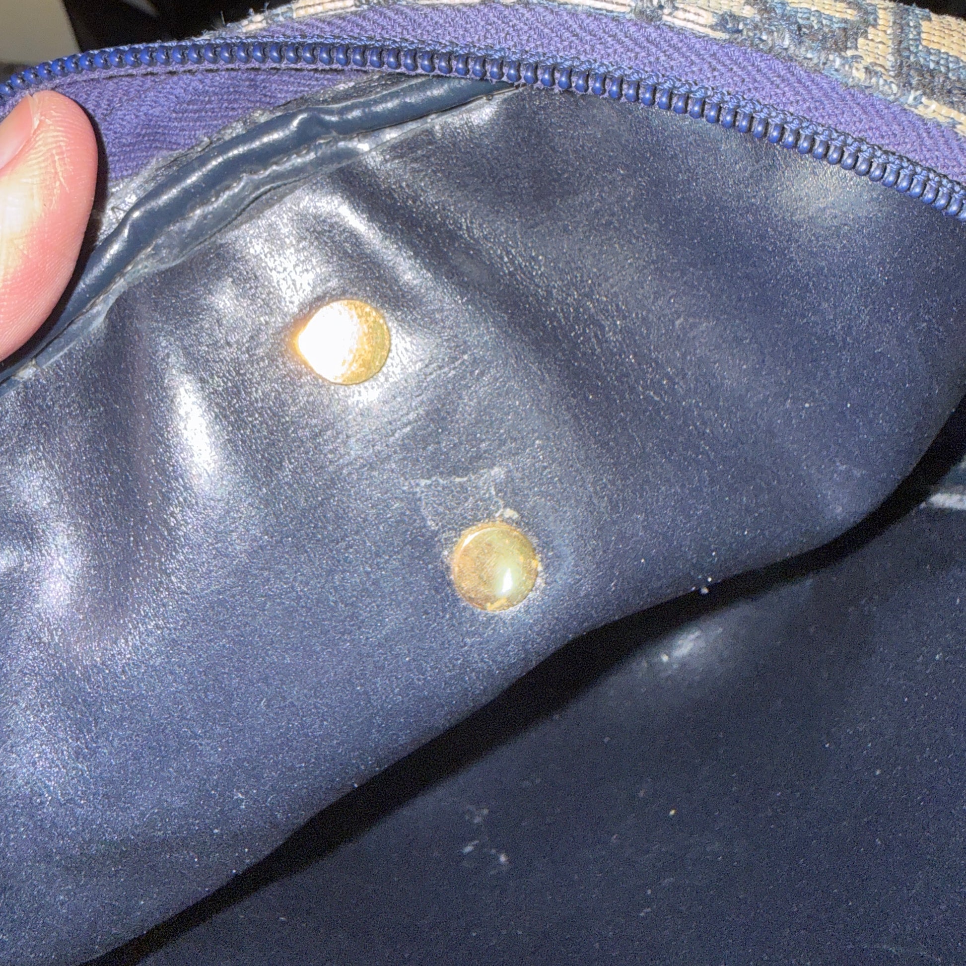 • Interior: Fair condition with noticeable wear. Interior lining has peeled, and heat stamp has faded and peeled (no longer visible)